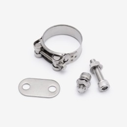 The exhaust fitting or fixing kit in a motorcycle includes all necessary hardware, such as bolts, gaskets, and clamps, for securely mounting and sealing the exhaust system components to the bike.