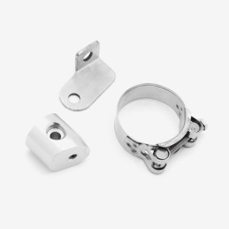 The exhaust fitting or fixing kit in a motorcycle includes all necessary hardware, such as bolts, gaskets, and clamps, for securely mounting and sealing the exhaust system components to the bike.