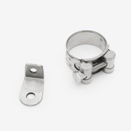 The exhaust fitting or fixing kit in a motorcycle includes all necessary hardware, such as bolts, gaskets, and clamps, for securely mounting and sealing the exhaust system components to the bike.
